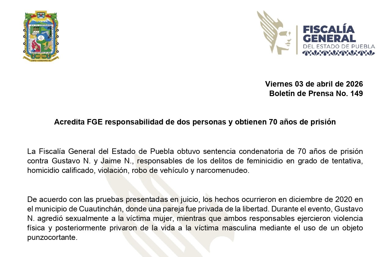 La Fiscalía General del Estado de Puebla obtuvo sentencia condenatoria de 70 años de prisión contra Gustavo N. y Jaime N., responsables de los delitos de feminicidio en grado de tentativa, homicidio calificado, violación, robo de vehículo y narcomenudeo.