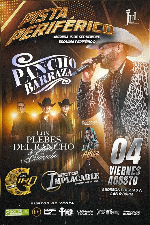 JEL Entertaiment anunció que el concierto de Pancho Barraza y Los Plebes del Rancho de Ariel Camacho llegaran a Puebla como parte de la gira “Leyenda en Vida Tour”. Ambos son exponentes del género regional mexicano y estaban anunciados para presentarse el viernes 4 de agosto en el Auditorio GNP a las 21 horas, el cual será cambiado de sede.