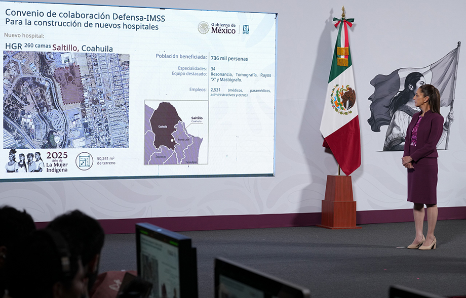 - Hospital General Regional de Saltillo, Coahuila con 260 camas; con una capacidad de atención de 736 mil personas con 34 especialidades; servicios de resonancia magnética, tomógrafo, rayos X, mastógrafo; 2 mil 531 trabajadores y trabajadoras. Contará con una construcción de 50 mil 241 metros cuadrados.