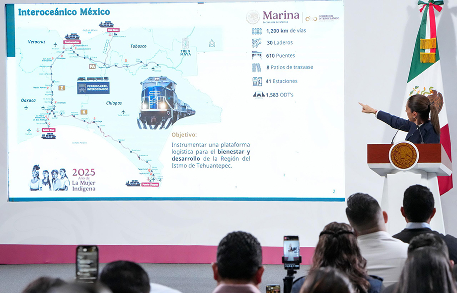 Ciudad de México, junio de 2025.- La Presidenta de México, Claudia Sheinbaum Pardo, destacó que el Corredor Interoceánico del Istmo de Tehuantepec es un proyecto que aporta al desarrollo económico de todo el país, además de que es un reconocimiento al sureste mexicano.