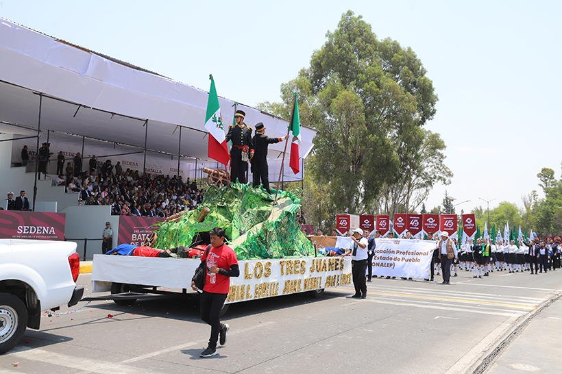 Los titulares de los Ejecutivos federal y estatal encabezaron el Desfile Cívico-Militar por el 162 Aniversario de la Batalla del 5 de Mayo de 1862, acto que reflejó la importancia de la entidad en la historia de México y en el que participaron contingentes de las Fuerzas Armadas y escolares, así como 10 carros alegóricos y aviones militares que sobrevolaron la capital poblana.