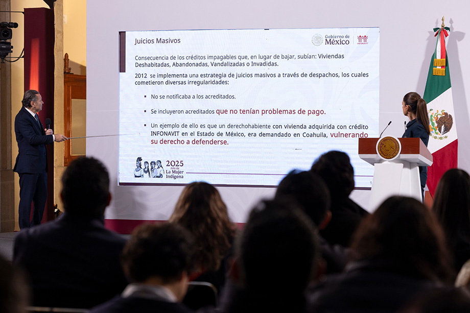 Ciudad de México, enero de 2025.- El Gobierno de México dio a conocer que, como parte del seguimiento al congelamiento de saldos y mensualidades a 2 millones de créditos por parte del Instituto del Fondo Nacional de la Vivienda para los Trabajadores (Infonavit), se detectó que, en 2012, se implementó una estrategia a través de la cual despachos legales interpusieron juicios masivos en contra de 373 mil derechohabientes, los cuales derivaron en que 249 mil perdieran la propiedad de su vivienda.