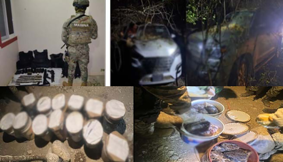 -En Caborca, personal de la Secretaría de Marina, derivado de información de inteligencia, aseguraron nueve armas largas, 3,502 cartuchos útiles, 55 cargadores, 13 artefactos explosivos improvisados, 95 poncha llantas, equipo táctico, cuatro vehículos (dos con blindaje artesanal y de fábrica) y dos cuatrimotos, en inmediaciones del poblado El Arenoso.
