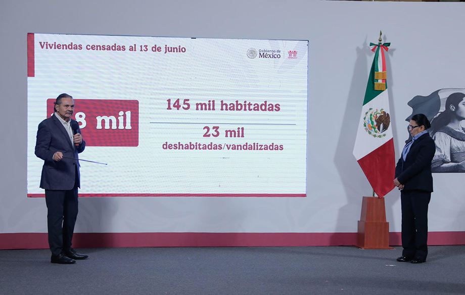 El ingeniero Romero Oropeza recordó que se firmó un convenio con la Secretaría del Bienestar a fin de realizar un censo de 843 mil viviendas emproblemadas. Al 13 de junio, dijo, se han censado 168 mil viviendas, de las cuales 145 mil se encuentran habitadas y 23 mil están deshabitadas y/o vandalizadas. Agregó que no habrá desalojos en las casas que están habitadas de manera irregular y que se dará la opción de adquirirlas a un precio muy económico en un esquema de renta con opción a compra.