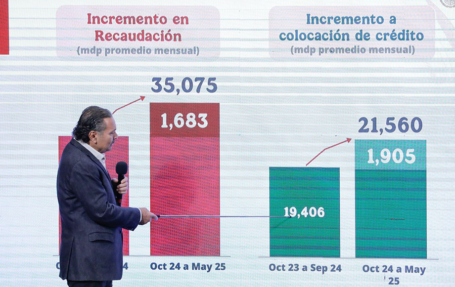 Detalló que la recaudación promedio del Instituto aumentó, con respecto a la administración anterior, para pasar de 33 mil 392 millones a 35 mil 75 millones de pesos mensuales. Además, se registró un incremento en el monto promedio de la colocación de créditos, al pasar de 19 mil 406 millones a 21 mil 560 millones de pesos mensualmente.