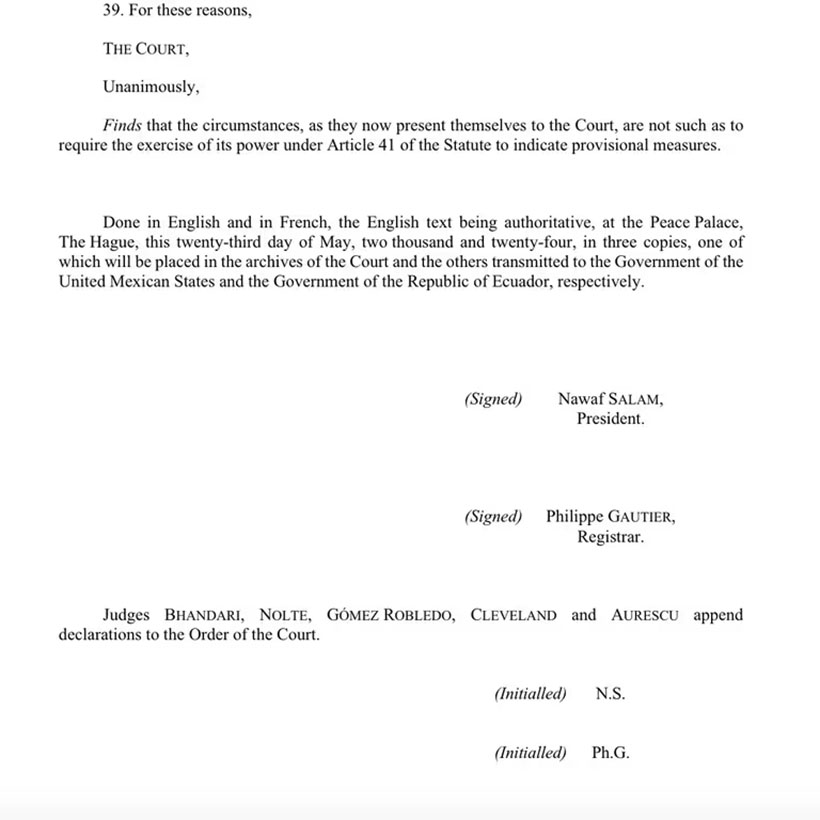 También, la Corte resaltó que “la decisión dictada… no afecta el derecho de los Gobiernos de México y Ecuador a presentar argumentos respecto de esas cuestiones”.