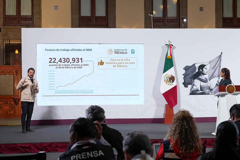 Ciudad de México, marzo de 2025.– La Presidenta de México, Claudia Sheinbaum Pardo, destacó que al 28 de febrero se tiene un registro histórico de 22 millones 430 mil 931 puestos de trabajo afiliados ante el Instituto Mexicano del Seguro Social (IMSS).