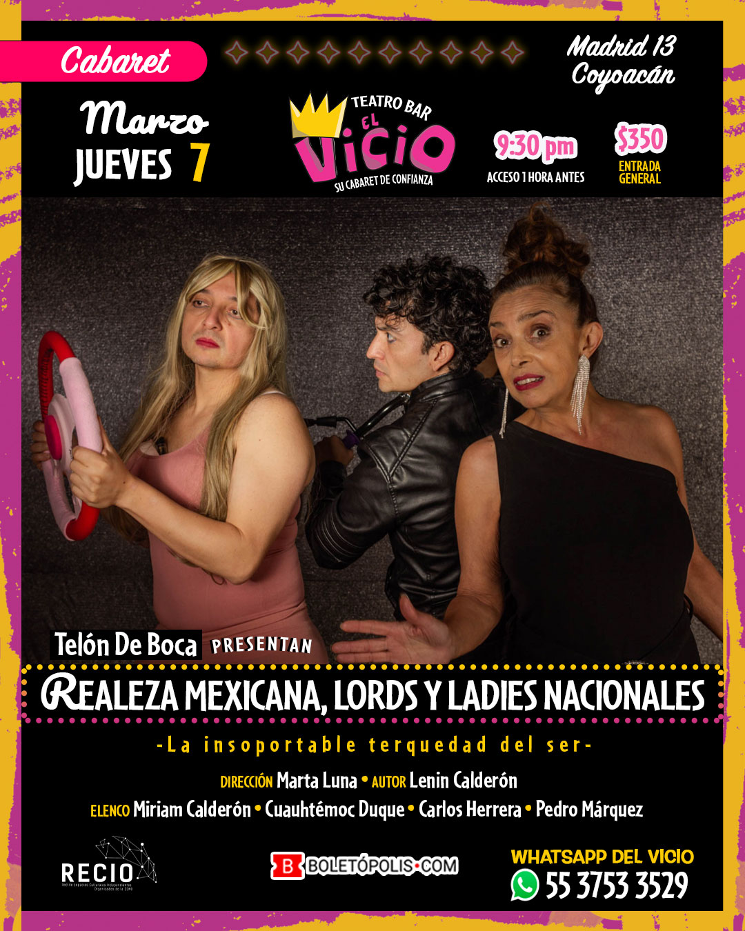 “REALEZA MEXICANA. NUESTROS ADORABLES LORDS Y LADIES” presenta la última función de temporada en el teatro bar El Vicio (Madrid 13, Colonia Del Carmen, Coyoacán), el jueves 7 de marzo, a las 21:30Hr. Adquiere tus boletos a través de http://nueprorealezamexicana.boletopolis.com/ ($350 pesos entrada general), o reserva tu lugar en el WhatsApp de El Vicio: 5537533529 y recíbelos directamente en la taquilla del teatro.